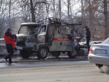 В районе 12 часов дня в центре города по адресу: улица Минаева, д.50 - на ходу загорелся автомобиль скорой помощи.