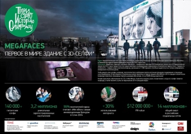 Проект MegaFaces, разработанный специально для Олимпийских игр 2014 в Сочи, стал маркетинговой сенсацией года. Он по праву может начать новое направление в современной архитектуре и digital технологиях. Это интерактивная высокотехнологичная конструкция не имеет аналогов в мире. Фасад здания представляет собой подвижную стену, состоящую из 11000 поршней, которые благодаря специально разработанному техническому решению способны создавать объемные портреты размером с трехэтажный дом: высотой 8, шириной 6 метров и глубиной 2 метра. Всего за время Олимпийских игр в Сочи на фасаде MegaFaces было показано более 140 тысяч лиц болельщиков со всего мира.