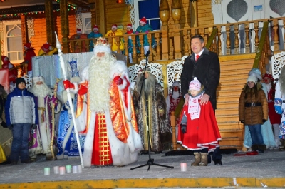 Валера Озеров, победитель конкурса благотворительного проекта МТС «Поколение М» вместе с Дедом Морозом и зажгли первую в стране новогоднюю ёлку в Великом Устюге.