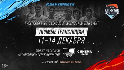 Лидирующая национальная кинотеатральная сеть СИНЕМА ПАРК и компания Riot Games (Райот Геймс) рады сообщить о проведении прямых трансляций главного турнира декабря – 2015 All-Star Event** – в 18 городах России!