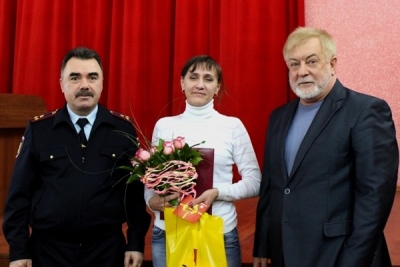 Начальник Управления МВД России по городу Тольятти полковник полиции Хейрулла Ахмедханов и председатель Общественного Совета Анатолий Волошин поблагодарили отважную жительницу Тольятти за оказание помощи полицейским.