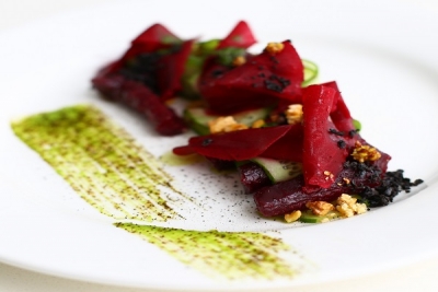 Многим гурманам понравится «Карпаччо из маринованной свеклы с грецкими орехами» - интересное сочетание текстур и вкуса печёной и маринованной свеклы, заправленной душистым маслом со свежим огурцом и топинатом из маслин.