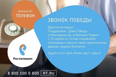 В честь Дня Победы «Ростелеком» традиционно дарит ветеранам и инвалидам Великой Отечественной войны возможность бесплатно пообщаться с однополчанами, родными и близкими в других городах России и ближнего зарубежья.