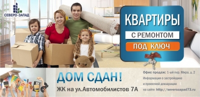 В доме представлены варианты квартир с отделкой «под ключ». В ремонт входят кафель, сантехника, обои, натяжные потолки, межкомнатные двери и входная дверь. Сотрудничество с поставщиками стройматериалов позволило компании «Северо-Запад» снизить стоимость ремонта до 217 тыс. рублей. В планах застройщика – представить квартиры с еще более доступной отделкой по цене до 130 тысяч рублей.