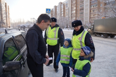 Юные гаишники с родителями и педагогами вышли на одну из оживленных улиц областного центра. Вместе со взрослыми инспекторами они останавливали машины, читали стихи про правила дорожного движения и призывали водителей быть очень аккуратными на дороге.