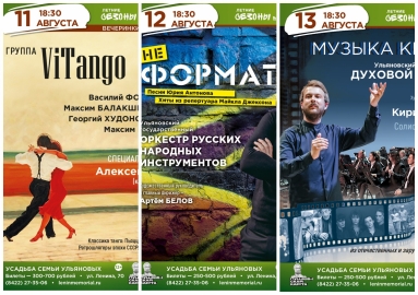 Музыкальные вечера в Усадьбе семьи Ульяновых пройдут с 11 по 13 августа (12+). Сезон «Вечеринок в Усадьбе» откроется музыкой страстного аргентинского танца группы ViTango в исполнении известных ульяновских музыкантов - Василия Форрата, Максима Балакшина, Георгия Худоногова и Максима Гикова. Специальным гостем станет Алексей Кулик.