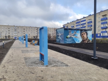 Подрядчику предстоит установить торговый павильон, две входные группы, Доску почета, пьедестал памятника «Самолет», сцену, стелу, игровые и спортивные площадки, скамейки, урны.