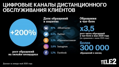 Tele2 проанализировала работу цифровых каналов дистанционного обслуживания. За первые пять месяцев 2020 года онлайн-площадки значительно опережали голосовые каналы по динамике числа обращений – прирост на 200% против 3% в кол-центре. Все большей популярностью среди клиентов пользуется чат-бот, который ежедневно обрабатывает 15 000 запросов на базе технологий искусственного интеллекта.