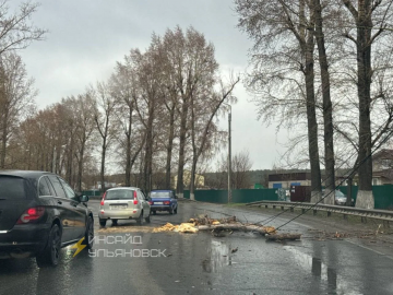Сегодня утром, 27 апреля, в Заволжском районе Ульяновска упало дерево на проезжую часть, оборвав при этом провода.