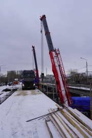 На мосту в створе улиц Шевченко-Смычки подготовили пролёты под монтаж несъёмной опалубки для последующего бетонирования дорожной плиты. В настоящее время первая партия опалубки поступила, к работам приступят в ближайшее время.