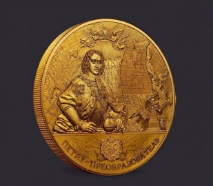 На фотовыставке можно будет увидеть, например, изображение золотой монеты номиналом 10 000 рублей, выпущенной в 2022 году. Чтобы подчеркнуть масштаб руководимого Петром государства, медальеры изобразили его на фоне настоящего исторического документа – Генеральной карты Российской империи. На монете есть растровое изображение (длинные узкие полосы) развернутого свитка, на котором при изменении угла наблюдения поочередно возникают силуэты бога торговли Меркурия и богини мудрости Минервы.