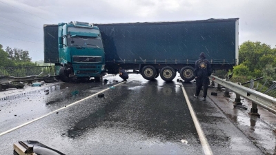 Сегодня днем, 2 июля, на трассе возле Чердаклов по направлению в сторону Димитровграда на железнодорожном мосту развернуло фуру, и она перекрыла всю дорогу.