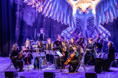 И ведь это не только концерт! Музыканты создают на сцене полный антураж школы Хогвартс: мантии факультетов, свечи, волшебные лампы, колбы с зельем и конечно же гигантская сова.