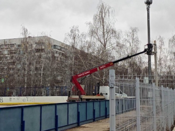 В рамках подготовки хоккейного корта к зимнему сезона на спортивном объекте установили дополнительную матчу освещения и смонтировали новый светильник.