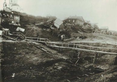 Первый на фотоСамым масштабным и катастрофичным по видимым последствиям в истории Симбирска считается оползень 29-31 мая (11-13 июня) 1915 года. Если предыдущие оползни известны нам только по описаниям, оползень 1915 года — вот оно, торжество технического прогресса! — мы можем лицезреть на фотографиях. Причём симбирян-фотолюбителей через прессу призывали делать снимки, сохраняя тем самым нюансы и подробности буйства стихии для науки.