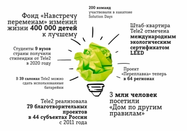 С самого начала работы в России Tele2 поддерживала талантливых социальных предпринимателей в рамках сотрудничества с фондом «Навстречу переменам». Tele2 видит социальную ответственность в создании развитой сети амбассадоров добра – лидеров, которые реально решают проблемы детей и подростков в регионах. Зная, с какими трудностями сталкиваются социальные стартапы, в пандемийный год Tele2 и фонд скорректировали формат конкурса и решили поддержать уже действующие проекты. Победители получили финансирование по 650 тыс. и помощь в разработке антикризисной стратегии. Инновацией прошлого года также стала образовательная программа, которая развивает импакт-инвестиции как инновационный финансовый инструмент. Совместно с фондом «Навстречу переменам» Tele2 провела первое в России импакт-шоу. Предприниматели представили проекты инвесторам и в онлайн-формате питчинга привлекли средства для своего бизнеса.