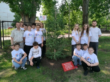 Памятная доска разместилась между деревьев, посаженных на 9 мая в честь 80-летия Победы. Еще одну лиственницу посадили перед отъездом школьники из Мариуполя.