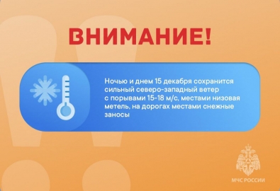 Ночью и днем 15 декабря в регионе сохранится сильный северо-западный ветер с порывами 15-18 м/с, местами низовая метель, на дорогах местами снежные заносы.