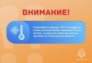 По данным МЧС, 13 декабря в период с 14-16 ожидается очень сильный ветер порывами 25 м/с, метель, на дорогах снежные, местами по Ульяновской области.