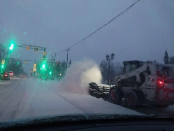 Днём 13 декабря на очистку улиц города вышло 56 спецмашин. Очищая дороги, работаем пятью колоннами, за которыми сразу же идёт противогололёдная обработка дорог. На тротуарах действуют трактора с плужно-щёточными механизмами и бункерами с пескоразбрасывателями.