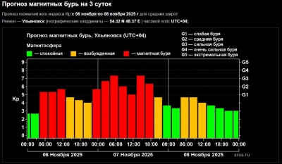 Согласно прогнозу Лаборатории солнечной астрономии Института космических исследований и Института солнечно-земной физики, уже сегодня, 6 ноября, с шести утра зафиксированы первые признаки геомагнитной нестабильности. Ожидается, что они продлятся до трех часов дня, достигнув умеренного уровня G2. После этого, с 15:00 и до полуночи, магнитосфера будет находиться в возбужденном состоянии, подготавливаясь к усилению бури на следующий день.
