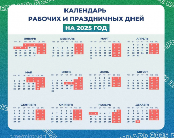 Минтруд России в своем официальном телеграм-канале опубликовал календарь, где отмечены все рабочие, выходные и праздничные дни в 2025 году.