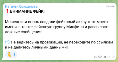 Брюханова уточнила, что мошенники создали фейковый аккаунт от ее имени и группу министерства финансов, рассылая ложные сообщения.