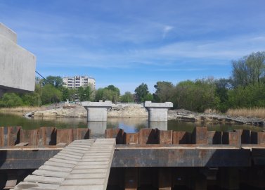 В настоящее время мостовики извлекают шпунтовое ограждение с пятой опоры, чтобы потом закрыть периметр вокруг опоры №6. После этого строители подготовят котлован и начнут последовательно бетонировать эту конструкцию.