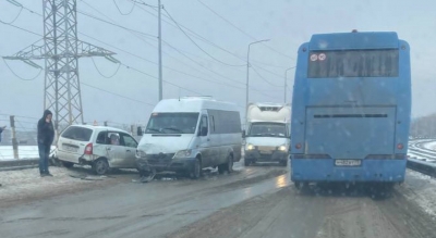 Сегодня, 27 февраля, около 11 часов утра в Заволжье на въезде на Императорский мост произошло ДТП: столкнулись учебный автомобиль ВАЗ и микроавтобус.