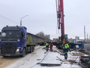 Для этого полностью смонтировано 20 новых железобетонных конструкций в средней части моста. Подрядчик продолжает сборку рельсошпальной решётки между путепроводом и руслом Свияги.