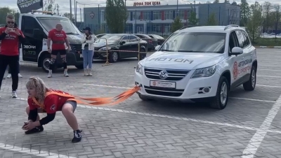 Мужчины тягают двухсоткилограммовую покрышку на количество раз. Следом выступила женщина, которая смогла протащить на несколько метров внедорожник весом две тонны.