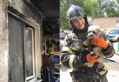Прибывшие на место пожарные проникли через балкон квартиры на первом этаже. Среди густого дыма в помещении они обнаружили собаку.