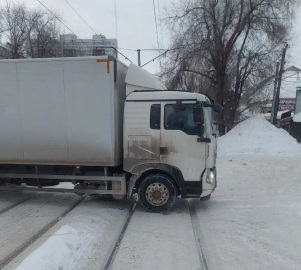 Сегодня утром, 12 февраля, на улице Радищева возле остановки «ул. Симбирская» в Ульяновске забуксовала фура на трамвайных рельсах, из-за чего пришлось остановить движение электротранспорта.