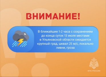 В ближайшие 1-2 часа с сохранением до конца суток 13 июля местами в Ульяновской области ожидается крупный град, шквал 25 м/с, локально ливни, гроза.