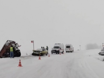 По словам свидетелей аварии, КамАЗ-пескотряс столкнулся с легковым автомобилем и вылетел в кювет.