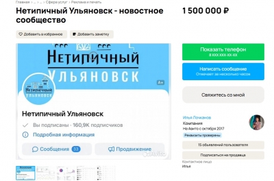 На платформе объявлений «Авито» 3 июня появилась карточка о продаже крупного городского паблика «Нeтипичный Ульянoвcк» в социальной сети «ВКонтакте» — владелец сообщества с аудиторией в 160 тыс. подписчиков готов расстаться с ним за 1,5 млн рублей из-за переезда в другой регион.