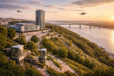 Энергетический и климатический хабЧерез 100 лет Ульяновск станет «батарейкой» Поволжья. Волга будет охлаждать гигантские компьютерные центры. Мини-станции будут встроены в опоры Президентского моста. Город получит дешевую энергию: отопление и электричество станут почти бесплатными. Во дворах появятся теплые зоны для прогулок.