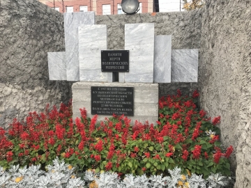 Сергей Гогин мне на это возразил: "Место знаковое, да, в подвалах этого здания производились расстрелы, но памятник втиснут в стену, для него словно нет места, там нет пространства вокруг, чтобы постоять, почтить. Рядом тротуар, и люди идут, и замечают как-то походя, если замечают его в этой нише вообще. Дух если и захватывает, то он стиснут, как этот памятник. Он неслучаен, но выглядит случайным...".