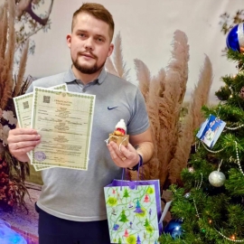 Счастливому папе вручили свидетельства о рождении дочек, а так же подарили талисман от молодожёнов, заключивших брак в канун Нового года.
