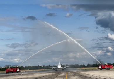 В Ульяновске вчера, 13 июля, запустили прямой авиарейс в Махачкалу. Для пассажиров первого рейса в здании аэровокзала был организован фуршет. Традиционно первый борт из Махачкалы был встречен водной триумфальной аркой.