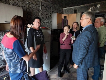 Вчера, вместе с заведующей районным отделением соцзащиты и представителем управляющей компании Юмакулов снова встретился с пострадавшими от пожара собственниками жилья.