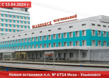 Пригородному поезду №6714 сообщением «Инза – Ульяновск» с завтрашнего дня, 13 апреля, назначаются новые остановки, сообщает Башкортостанская ППК.