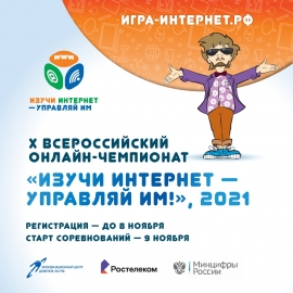 Продолжается регистрация участников на X Всероссийский онлайн-чемпионат «Изучи интернет — управляй им!». Соревнования для школьников и студентов до 18 лет проводят «Ростелеком» и Координационный центр национального домена сети интернет при поддержке Министерства цифрового развития, связи и массовых коммуникаций РФ и Роскомнадзора. Онлайн-чемпионат пройдет 9–25 ноября 2021 года на официальном сайте проекта игра-интернет.рф. Регистрация участников продлится до 8 ноября включительно. Объявление результатов намечено на 9 декабря.