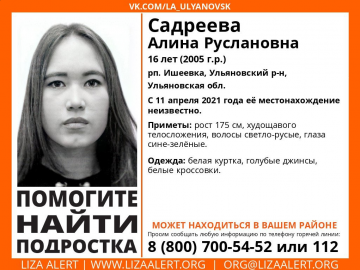 Волонтёры из поисково-спасательного отряда «Лиза Алерт» сообщают, что в посёлке Ишеевка Ульяновского района пропала 16-летняя местная жительница Алина Садреева. Её не могут найти с 11 апреля.