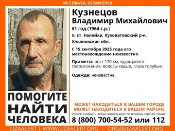 В сообщении говорится, что в Кузоватовском районе Ульяновской области 15 сентября пропал 61-летний житель станции Налейка Владимир Кузнецов. Его до сих пор не нашли.