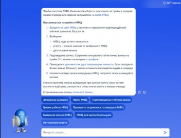 Если нужно получить услугу в МФЦ, робот Макс подробно расскажет, как это сделать с указанием нужных ссылок на сайте МФЦ Ульяновской области. Это поможет найти нужный центр, проверить график работы и сразу записаться на приём.