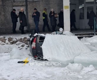 Лёд упал на припаркованные там автомобили. «Ладу Приору» буквально смяло под тяжестью глыбы.