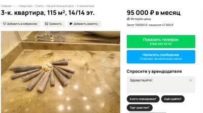 Жилье на Железнодорожной – это квартира в 115 кв. м под самой крышей, на 14-м из 14-ти этажей. В описании говорится, что «роскошная квартира» находится в элитном районе города, имеет «дизайнерский ремонт и шикарный вид из окна». Судя по фото в объявлении, из окна открывается вид на крыши соседних многоэтажек. Из примечательного: в череде снимков – крупным планом камни белемниты (называемые в народе «чертовыми пальцами»), разложенные на столешнице в ванной.
