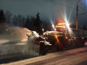 Ночью на городских дорогах работало 97 единиц спецтехники. За сутки для обработки дорог и тротуаров использовали 370 тонн пескосоляной смеси.
