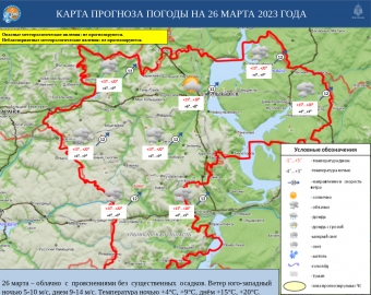 Синоптики ожидают, что 26 марта по области возможно потепление до +15°С, +20°С днем. Будет облачно с прояснениями без существенных осадков. Скорость ветра днем может достигать 9-14 м/с, ветер юго-западный. Неблагоприятных или опасных метеорологических явлений не прогнозируется.
